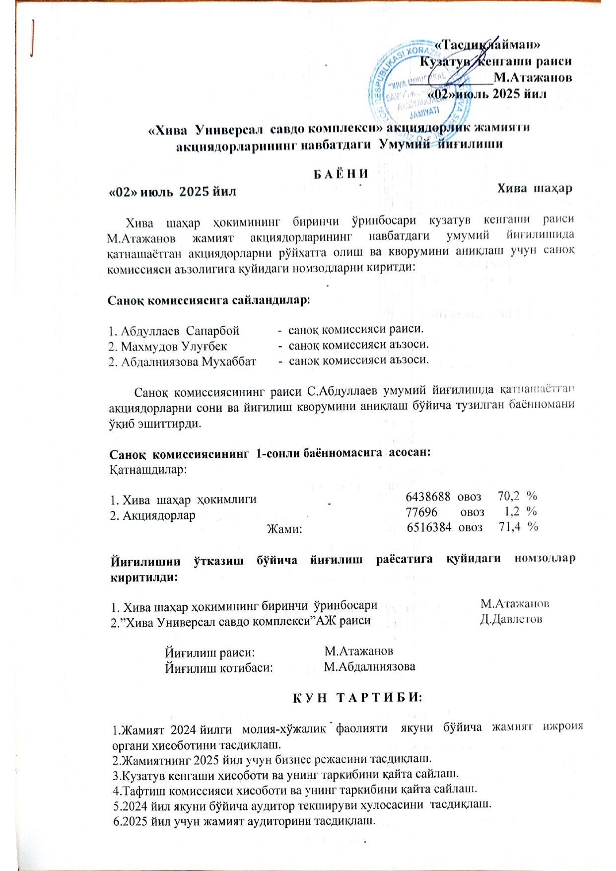 “Хива Универсал савдо комплекси” ақциядорлик жамияти ходимларининг кенгайтирилган йиғилиш 1-сонли баёни...