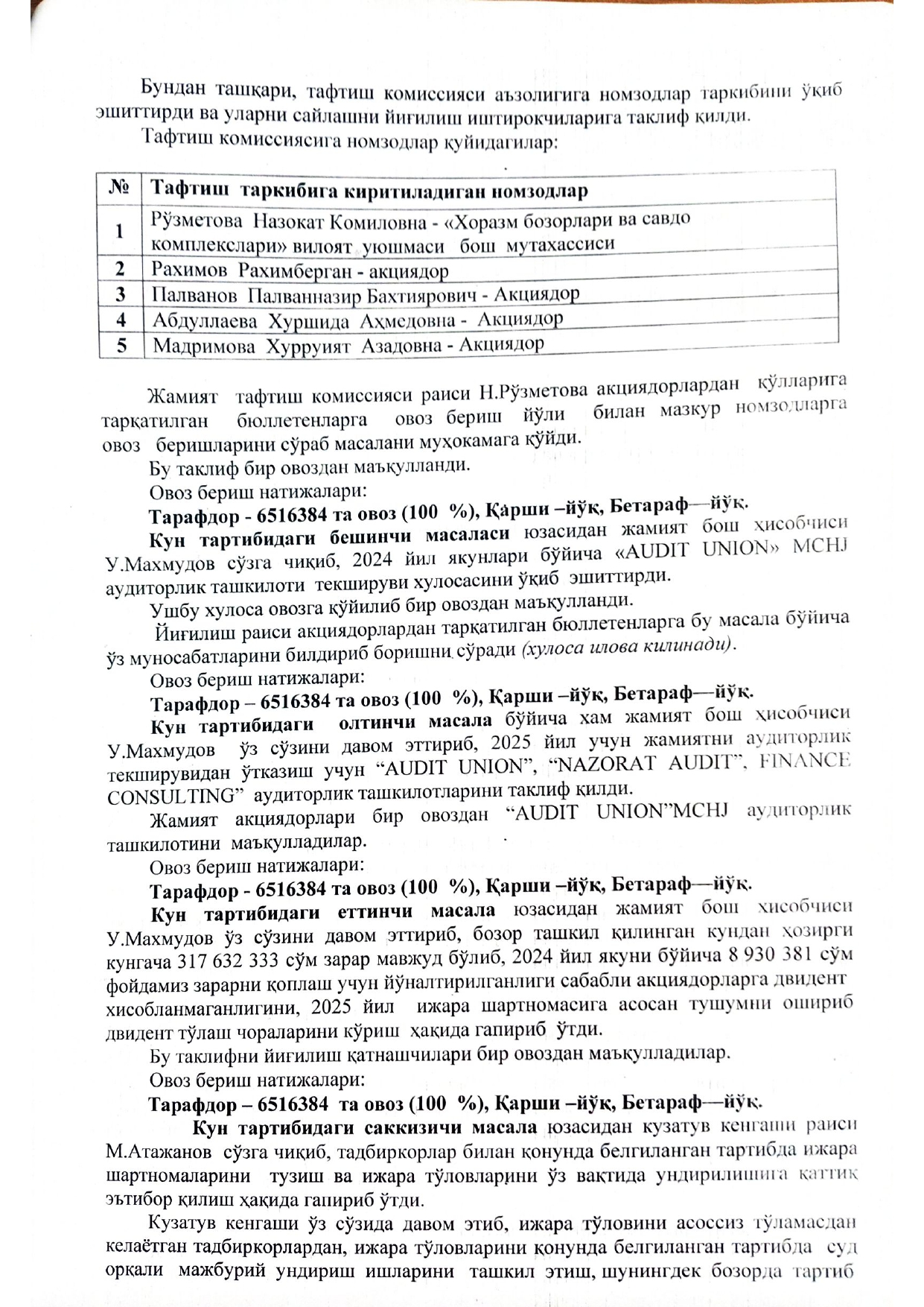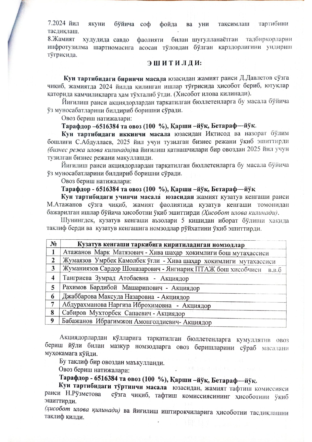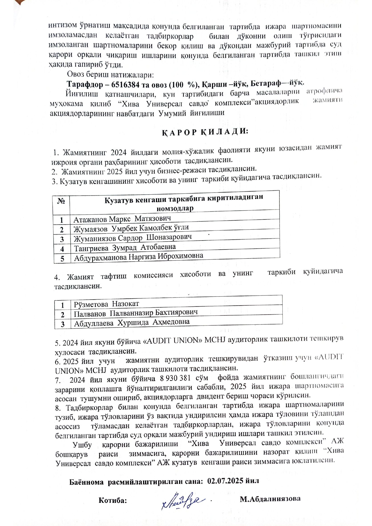 «Хива Универсал савдо комплекси» акциядорлик жамияти Маъмурияти аъзолари йиғилишининг...