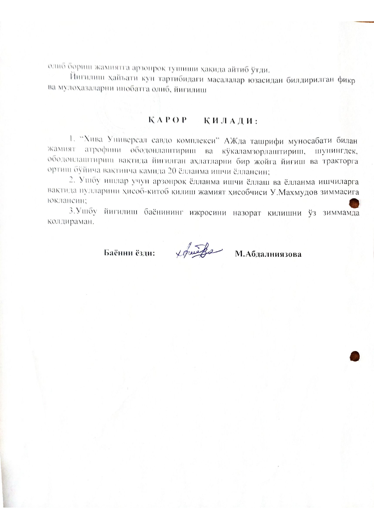 «Хива Универсал савдо комплекси» акциядорлик жамияти Маъмурияти аъзолари йиғилишининг...