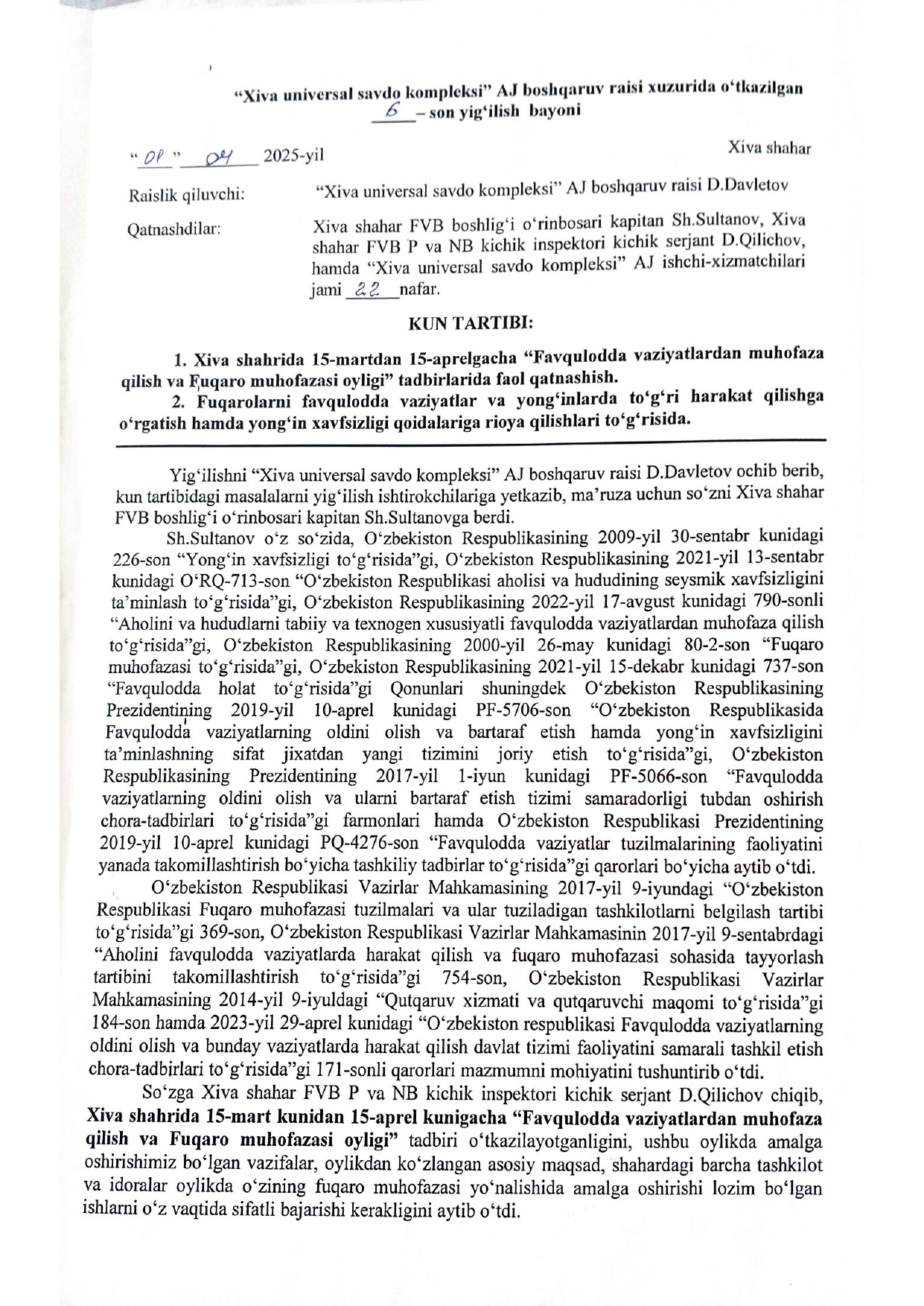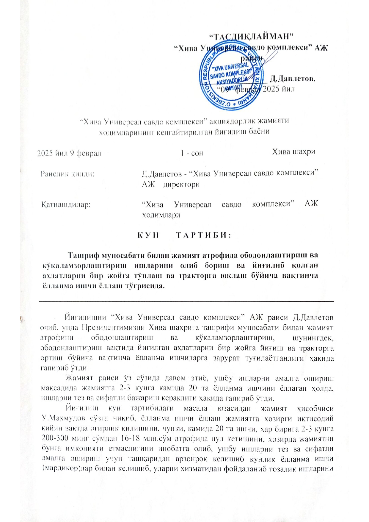 “Хива Универсал савдо комплекси” ақциядорлик жамияти ходимларининг кенгайтирилган йиғилиш 1-сонли баёни...