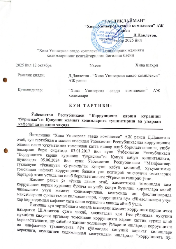 “Хива Универсал савдо комплекси” ақциядорлик жамияти ходимларининг кенгайтирилган йиғилиш 1-сонли баёни...